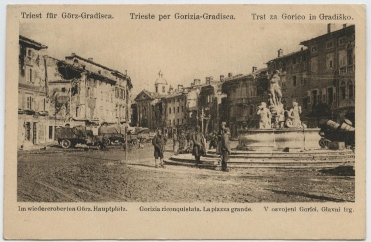 | NOTE | Sul recto: titolo parallelo "Triest für Görz-Gradisca. Im wiedereberten Görz. Hauptplatz. Gorico in Gradiško. V osvojeni Gorici. Glavni trg." Sul verso; timbro circolare: "Comitato della giornata del soldato / Trieste pro Gorizia". Cartolina non viaggiata. La ripresa fotografica è successiva al ritorno dell'esercito austriaco in città dopo la battaglia di Caporetto. |