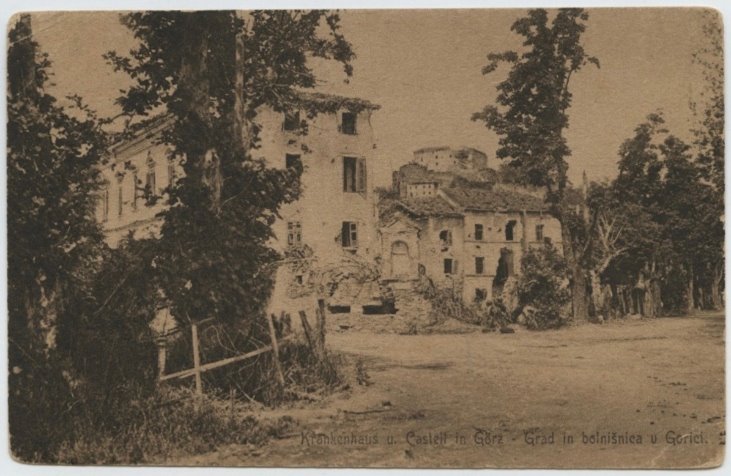 | NOTE | Sul verso: "Photohdlg. Eduard Grapulin, Görz 1918.". Cartolina viaggiata il 03.05.1919. L'ospedale femminile ripreso da via dietro il Colle corrispondente a uno dei tratti dell'attuale via Giustiniani. Durante la Prima guerra mondiale servì da ospedale militare venendo seriamente danneggiato. A sinistra il lato corto del Convento delle Suore di Carità di via Dreossi con l'edicola mariana. |