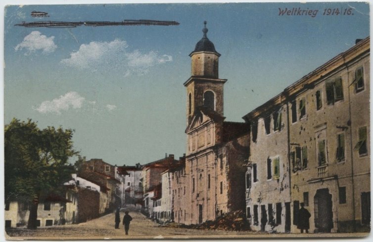 | TITOLO | Weltkrieg 1914/16. Görz Zerstörte Kirche und eingestürzte Häuser in Piazzutta. |