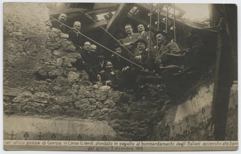 | SOGGETTO | Uomini - Ritratto di gruppo - Gorizia Gorizia - Corso Giuseppe Verdi (già Via del Giardino) - Ufficio delle Poste e Telegrafi - Danni di guerra - Guerra mondiale 1914-1918 |