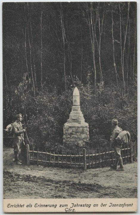 | NOTE | Sul verso: "Hofmann-Eckerl, Laibach". Il monumento commemorativo ricavato da un'ogiva inesplosa non si è conservato. Sul proiettile si distinguono la sigla "A. T. A. 5" e le date 1915 - 1916. |