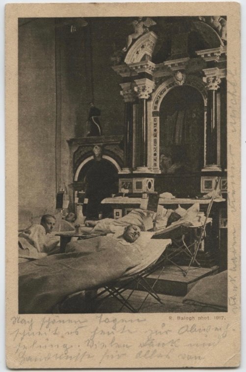 | NOTE | Sul recto: "R. Balogh phot. 1917". Sul verso: titolo; "Verlag: Isonzofonds Feldpost 515. Serie III"; "Reingewinn zugunsten der Witwen u. Waisen von Gefallenen an der Isonzofront.". Cartolina viaggiata in franchigia; timbro: "K.u.k.Hauptfeldpostamt 426/ 17.II.18". Cartolina di una serie emessa per la raccolta di fondi a favore delle vedove e degli orfani di guerra. La ripresa mostra la cappella laterale della chiesa di San'Egidio di Sutta/Sveto dove venne allestito un ospedale militare austro-ungarico. La cartolina venne spedita alla pittrice goriziana Melitta Rojic. |