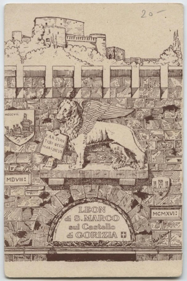 | NOTE | Sul verso: timbro "Ricovero profughi dalle zone di guerra Via Galilei 21 - Roma"; "Danesi - Roma". Cartolina non viaggiata. Disegno posto sulla copertina dell'opuscolo "Come l'impronta del Leon di S. Marco si trova sul Castello di Gorizia", stampato a Roma nel 1916, di cui è autore l'architetto goriziano Antonio Lasciac (1856-1946). Il leone di San Marco venne collocato all'ingresso del castello il 25 aprile del 1919. |