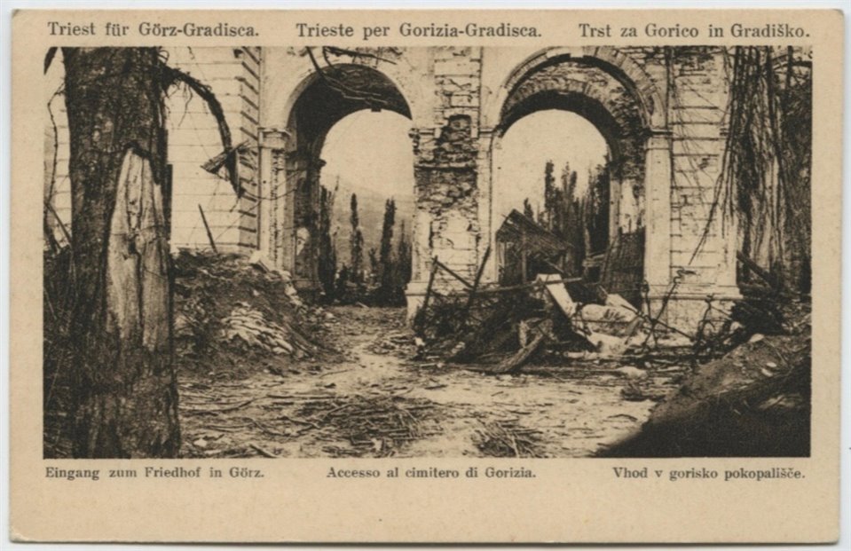 | NOTE | Sul recto: titolo; titolo parallelo "Triest für Görz-Gradisca./ Eingang zum Friedhof in Görz."; titolo parallelo "Trst za Gorico in Gradiško./ Vhod v gorisko pokopališče." Sul verso: timbro "Comitato della giornata del Soldato 'Trieste pro Gorizia' [17 Agosto 1918]". Cartolina non viaggiata. Il cimitero di Gorizia era stato trasferito nel 1880 fuori dal centro cittadino in località Grazigna. Distrutto durante la Prima guerra mondiale, venne dismesso. L'area è oggi compresa nel centro di Nova Gorica. |