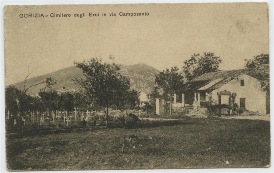 | NOTE | Sul verso: "1-8858 G.C.G.". Cartolina non viaggiata. Datazione per confronto con altri esemplari dello stesso editore. È verosimile si tratti del cimitero ubicato tra la via della Bianca e via del Camposanto (oggi Nova Gorica) descritto in documenti dell'Archivio di Stato di Gorizia come il "Cimitero n. 1 3za Zona esistente in città, Via della Bianca, fondo di proprietà delle RR. MM. Orsoline, presso la casa n. 16 diviso in X (10) file o reparti e comprende 184 (centottantaquattro) fosse, a sinistra della via Camposanto." Le salme vennero esumate nel marzo del 1919. Un altro cimitero di guerra in via del Camposanto si trovava "A destra ove attraversa la ferrovia circa 40 m. dalla strada. 40 sepolture". Anche quest'area ricade in territorio sloveno. |
