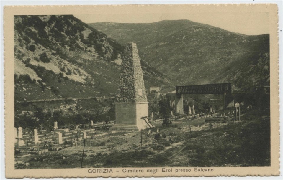 | NOTE | Sul verso: "1-8853 G.C.G.". Cartolina non viaggiata. Bordi fustellati. Il cimitero di guerra di Salcano era dedicato al capitano Tommaso de Candia. Sullo sfondo il ponte ferroviario di Salcano che, in attesa della ricostruzione, era percorribile grazie a una traversa provvisoria. |