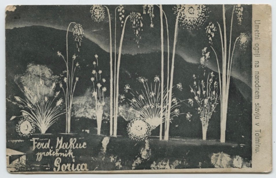 | NOTE | Sul recto: "Ferd. Makuc pyrotehnik Gorica". Sul verso: "Fotograf Weiss, Gorica.". Cartolina viaggiata; francobollo asportato. Data del timbro postale non leggibile ma precedente il 22 luglio del 1914, quando un'esplosione distrusse la fabbrica di fuochi artificiali di Ferdinando Makuc, allora situata in via Ristori a Gorizia. |