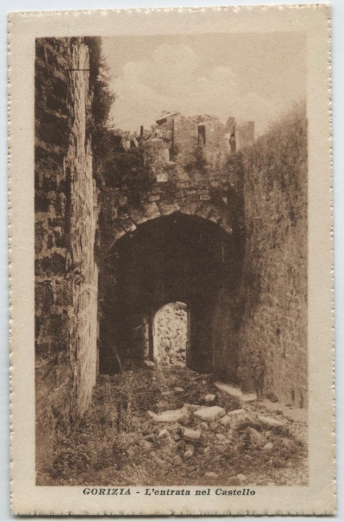 | NOTE | Sul verso : "Edizione Antonio Pertol [sic] - Gorizia"; "Con appr. Ufficio Rev. Stampa, Milano - N. 7772"; "L. Felletti - Milano"; "Fot. Maria Förster - Freund (Vienna)". Cartolina non viaggiata. Bordi fustellati. Datazione per confronto con esemplari della stessa serie presenti in collezione. L'ingresso del castello ripreso dall'interno delle mura perimetrali. |