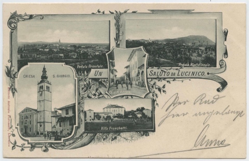 | NOTE | Sul recto: titolo delle vedutine ("Veduta Orientale."; "Veduta Meridionale.""Chiesa S. Giorgio."; "Villa Franchetti."); "Editore Antonio Fornasari, Lucinico". Cartolina viaggiata il 30.04.1899. |