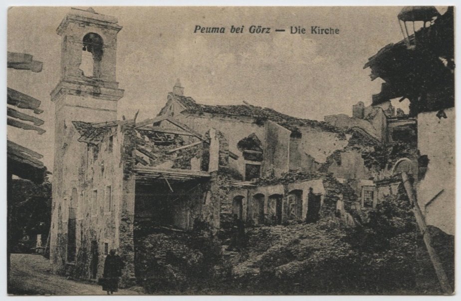 | SOGGETTO | Piuma/Pevma (Gorizia) - Chiesa di San Silvestro - Danni di Guerra - Guerra mondiale 1914-1918 |