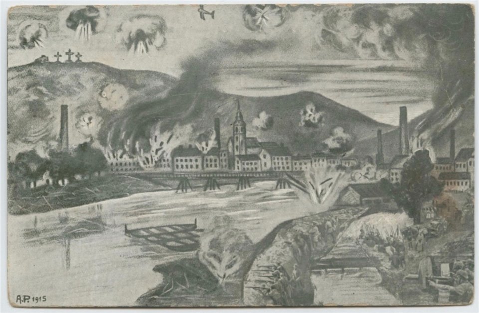 | NOTE | Sul recto, iniziali dell'illustratore e data: "A. P. 1915". Sul verso: titolo; "Verlag Kartonnagenfabrik Pertot, Görz. A.P.G. N. 6". Cartolina non viaggiata. Fin dal primo anno di guerra l'abitato di Podgora si trovò al centro dei combattimenti, come documenta con semplicità e immediatezza l'illustrazione del 1915 tradotta in cartolina. |