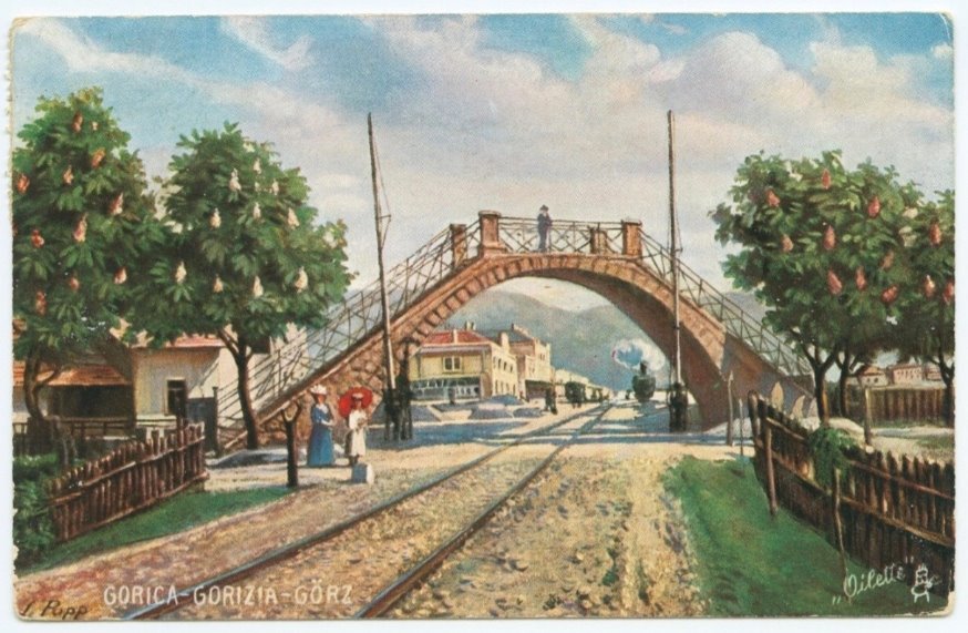 | NOTE | Sul recto: a sinistra in basso indicazione di responsabilità "J. Popp"; a destra"Oilette", nome della serie pubblicata dall'editore Tuck & Sons di Londra dal 1903 con riproduzioni di dipinti. Sul verso: "Weite - Weite - Welt serien"; " [logo] Raphael Tuck & Sons 'Oilette' Serie Görz N. 674B (...)"; "Verlag: A. Gabršček, Görz". Cartolina viaggiata il 03.11.1916. Timbro: "Zensuriert (...) Haid[enschaft]". Sotto l'arco della passerella si intravede a sinistra il complesso della stazione Transalpina; in prossimità della passerella le sbarre sollevate di un passaggio a livello. |