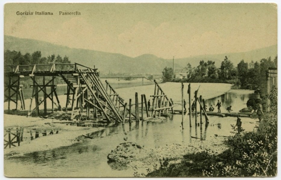 | NOTE | Sul verso: "[logo] IPA/ CT"; "2751". Cartolina non viaggiata edita dopo l'agosto del 1916. Ponte militare di legno sull'Isonzo costruito a valle della passerella di Straccis bombardata che si scorge in lontananza. |