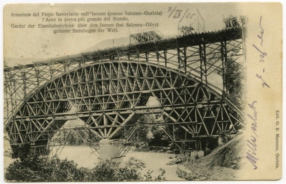 | NOTE | Sul recto: titolo parallelo "Gerüst der Eisenbahnbrücke über den Isonzo (bei Salcano - Görz), grösster Steinbogen der Welt."; "Edit. G. B. Mazucco" . Sul verso: "51280". Cartolina viaggiata il 07.09 1905 durante la costruzione del ponte inaugurato nell'aprile del 1906. |
