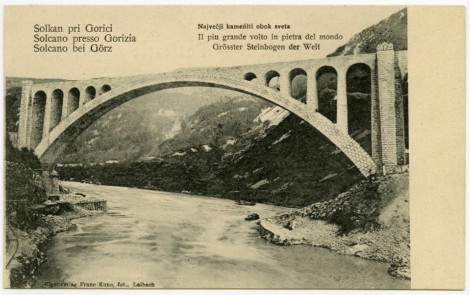 | NOTE | Sul recto: titolo; titolo parallelo "Solkan pri Gorici. Najjvečji kameniti obok sveta/ Solcano [sic] presso Gorizia. Il più grande volto in pietra del mondo/ Solcano bei Görz- Grösster Steinbogen der Welt"; "Eigenverlag Franc Kunc fot., Laibach". Sul verso timbro: "Sv. Gora pri Gorici Monte Santo presso Gorizia I. Černe Gostilničar - trattore 21. Aug. 1906". Cartolina non viaggiata |