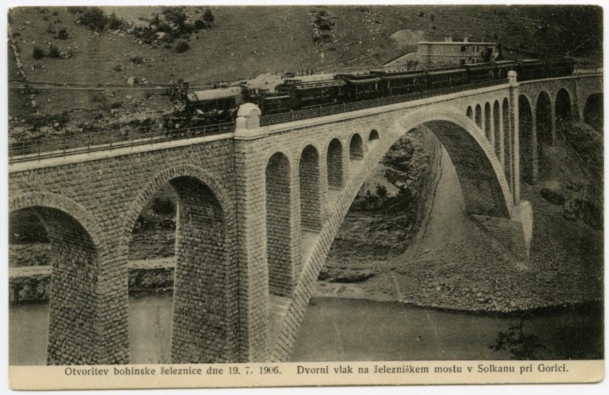 | NOTE | Sul verso: "Fotograf A. Jerkič, Gorica. Ponatis prepovedan.". Cartolina viaggiata il 31.08. 1906. Nella cartolina il passaggio del treno inaugurale sul ponte di Salcano; il convoglio con a bordo l'arciduca Francesco Ferdinando transitò sul ponte ferroviario il 19.07.1906 in direzione di Gorizia Stazione Nord (Transalpina). |