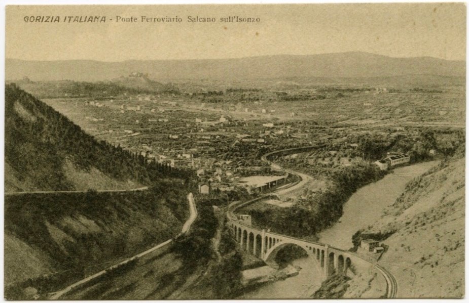 | NOTE | Sul verso: "[logo] IPA/ CT"; "1806". Cartolina non viaggiata. IPA-CT fu una delle denominazioni assunte nel tempo dall'Istituto Poligrafico Alterocca. Il ponte di Salcano venne fatto saltare l'8 agosto 1916 dagli Austriaci. La cartolina, edita dopo il passaggio di Gorizia all'Italia, mostra lo stato ante quem. |
