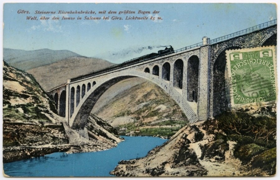 | NOTE | Sul recto: titolo "Görz. Steinerne Eisenbahnbrücke, mit dem größten Bogen der Welt, über den Isonzo in Salcano bei Görz. Lichtweite 85 m."; "[logo] Austria". Sul verso: ""B. K. Sch. W. Nr. 90/I"; "14655". Cartolina viaggiata il 07.06.1913. |