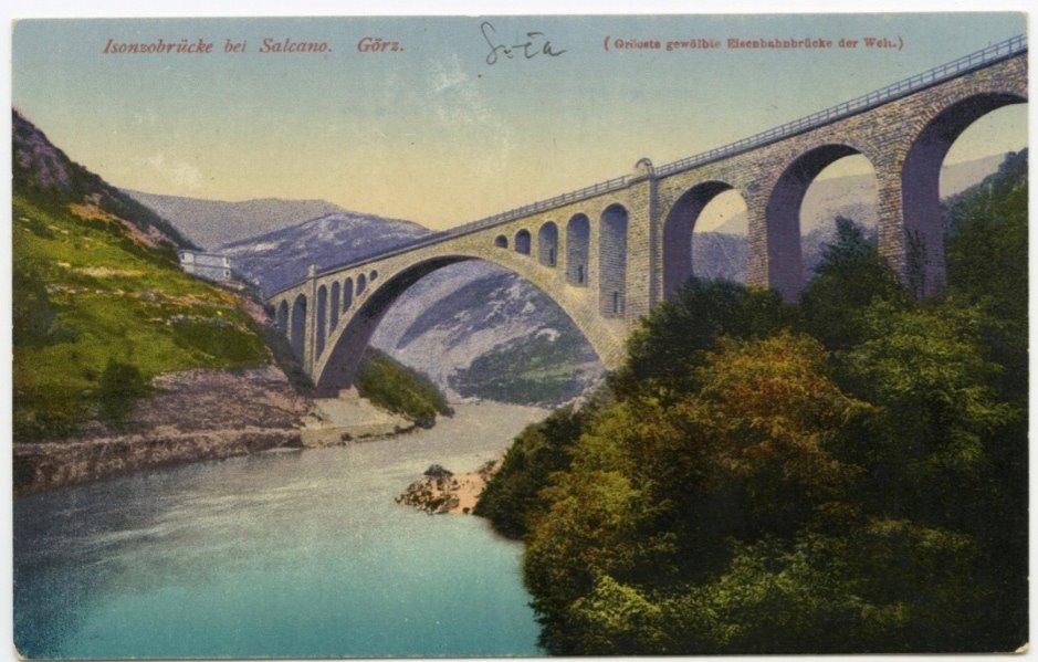| TITOLO | Steinerne Isonzobrücke bei Salcano. Görz. (Grösste gew ölbte Eisenbahnbrücke der Welt.) |