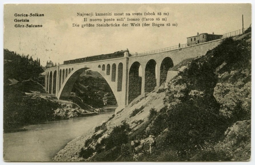 | NOTE | Sul recto: titolo e titolo parallelo: "Gorica-Solkan. Najvecji kameniti most na svetu (obok 85 m)/ Gorizia. Il nuovo ponte sull'Isonzo (l'arco 85 m)/ Die größte Steinbrücke der Welt (der Bogen 85 m)". Sul verso:"18038 A. Gabršček, Gorica". artolina viaggiata il 17.04.1908. |