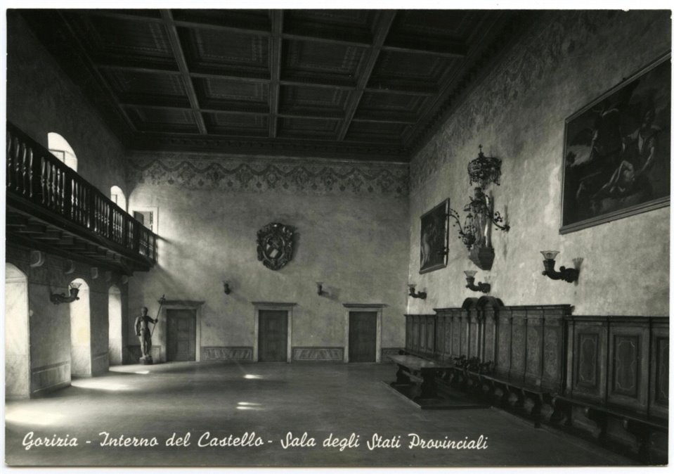 | NOTE | Sul verso: "45 Ed. Foto G. Lazzaro - Gorizia"; "Vera fotografia". Cartolina non viaggiata. Immagine pubblicata in Il Castello di Gorzia. Breve guida turistica, Gorizia 1953, p. 37. Attualmente la sala degli Stati Provinciali è inclusa nel percorso del Museo del Medioevo Goriziano e ospita un'esposizione di riproduzioni di strumenti musicali dal X al XVII secolo. |