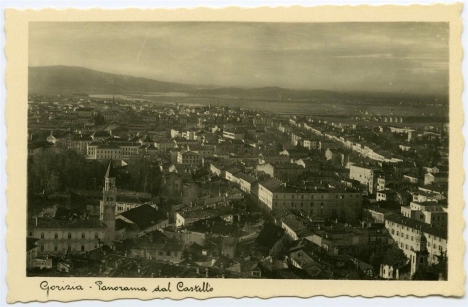 | NOTE | Sul verso: "N. 57 - Ripr. ris. V. Molesini - Gorizia "; "vera fotografia 'Aurosmalto'"; "Fotostampa A. Traldi - Milano". Bordi ondulati. Cartolina non viaggiata. Veduta panoramica di Gorizia verso ovest. Riconoscibili il palazzo De Bassa e l'area del Passaggio Edling. A destra in basso si scorge il palazzo della Camera di Commercio (1933) e più sotto la parte alta del campanile della chiesa delle Orsoline. Sullo sfondo, l'Isonzo. |