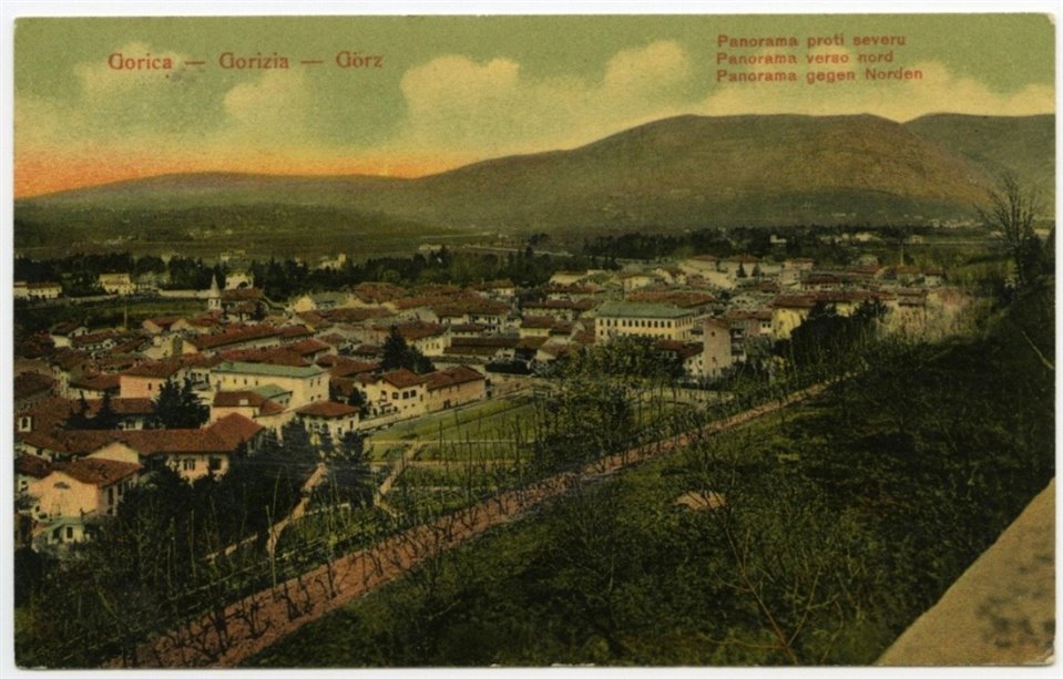 Sul recto: titolo e titolo parallelo "Gorica - Gorizia - Görz Panorama proti severu/ Panorama verso nord/ Panorama gegen Norden". Sul verso: "A. Gabršček, Gorica 1909. 4904/8"; "201012". Cartolina viaggiata nel 1912. |