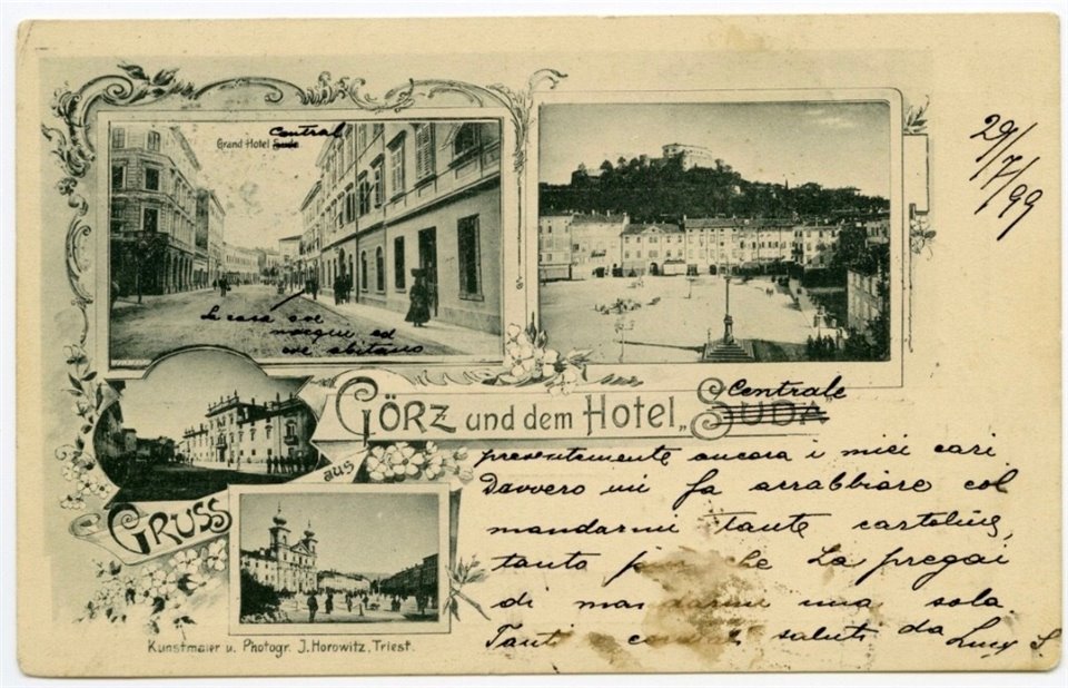 Sul recto: titolo di una vedutina ("Grand Hotel Suda" [denominazione "Suda" corretta a penna con "Centrale"]) ; "Kunstmaler u. Photogr. J. Horowitz , Triest". Cartolina viaggiata il 30.07.1899. |