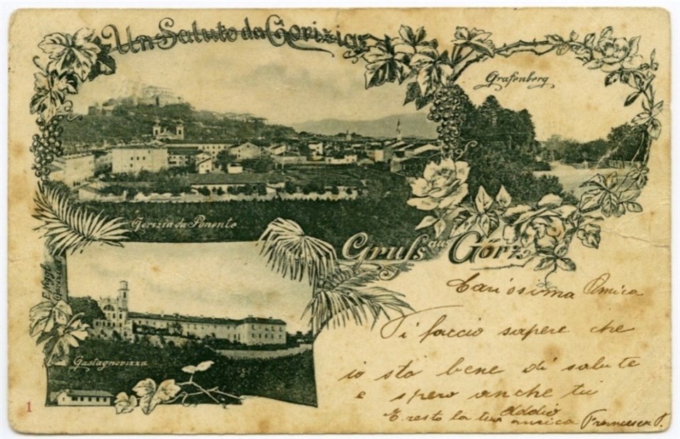| NOTE | Sul recto: titolo delle vedutine ("Gorizia da ponente"; "Grafenberg"; "Castagnovizza"); "E. Niggl Gorizia"; "1". Cartolina viaggiata il 04.03.1898. Per la veduta panoramica di Gorizia cfr. Note inv. 01047. |