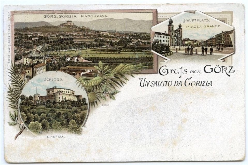 | NOTE | Sul recto: titolo delle vedutine ("Görz, Gorizia, Panorama"; "Hauptplatz Piazza Grande"; "Schloss Castell"); "Druck u. Verlag v. Louis Glaser, Leipzig/ Vertreter: R. Karlmann, Wien, VII/2"; "2683". Cartolina viaggiata; francobollo asportato. |