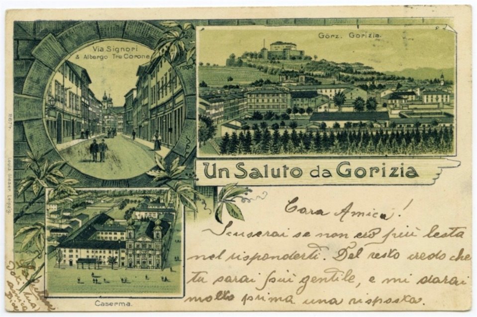 | NOTE | Sul recto: titolo delle vedutine ("Via Signori & Albergo Tre Corone"; "Görz, Gorizia."; "Caserma"); "2674 Louis Glaser, Leipzig". Cartolina viaggiata il 18.08.1900. |
