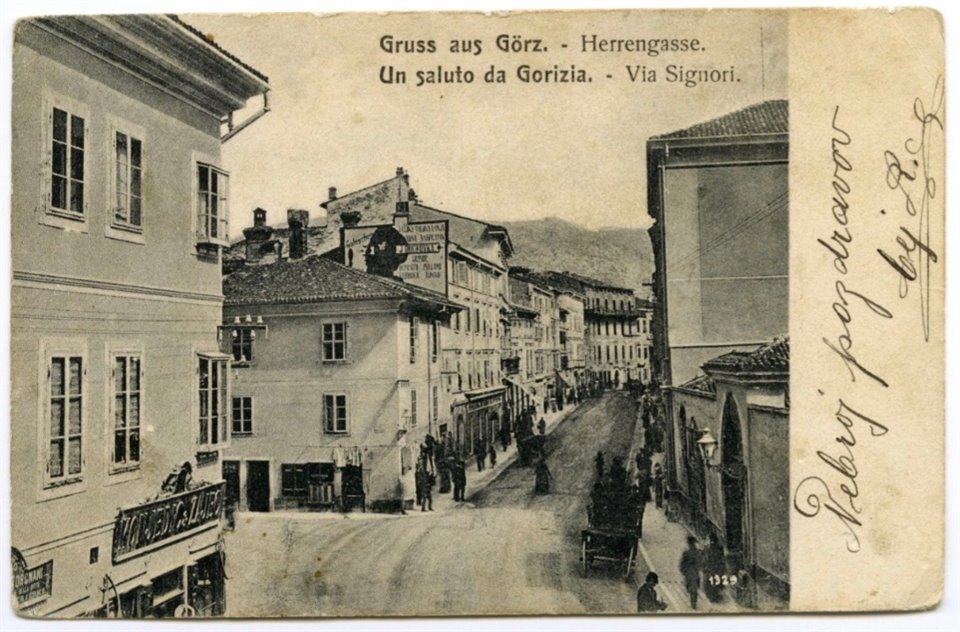 | NOTE | Sul recto: "1929". Sul verso: "Verl A. Jeretič, Görz". Cartolina viaggiata prima del 1908; data del timbro postale non leggibile. La ripresa fotografica è precedente il 1903 quando il quarto edificio a sinistra in via dei Signori venne sopraelevato. |