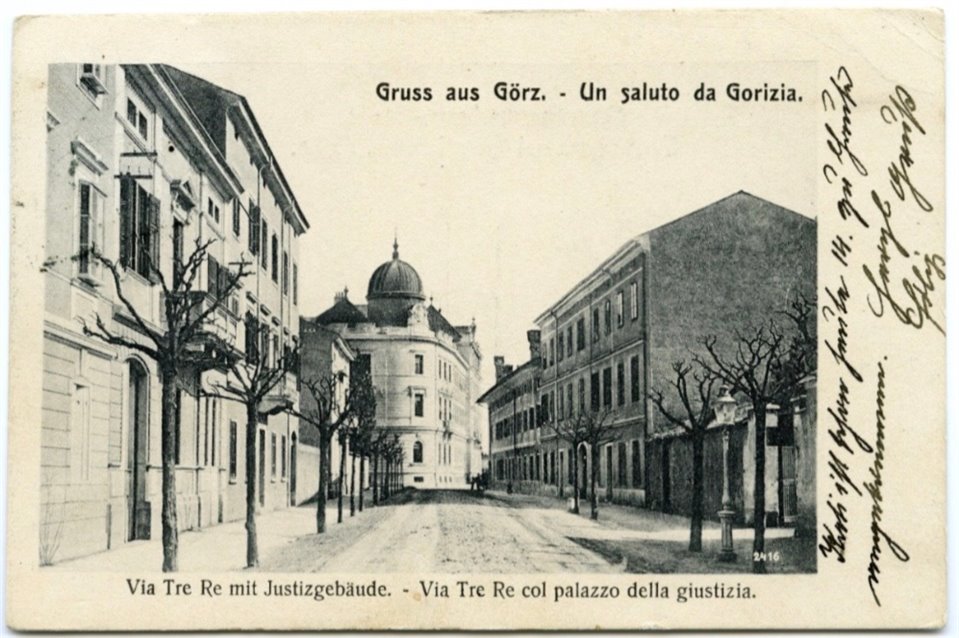 | NOTE | Sul recto: titolo; titolo parallelo "Via Tre Re mit Justizgebäude.". Sul verso: "Verl. A. Jeretič, Görz.". Cartolina viaggiata il 13.07.1911. |