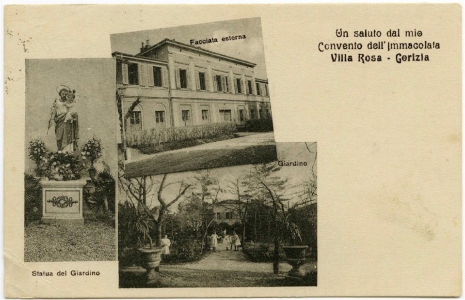 | NOTE | Sul recto: titolo delle vedutine ("Facciata esterna"; "Statua del Giardino"; "Giardino"); "Verlag von A. Jeretič, Görz". Sul verso: "9018". Cartolina viaggiata il 15.07.1912. Il Convitto dell'Immacolata aveva sede in villa Rosa in via degli Orzoni 32. |