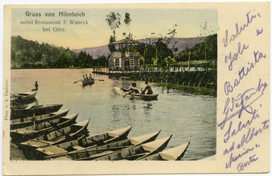 | NOTE | Sul recto: "Photo v. A. Pammer". Cartolina viaggiata; data del timbro postale non leggibile. Il rinomato ristorante Sans Souci di Valdirose fu costruito nel 1902 dalla famiglia Wanek proprietaria dell’intero sito che comprendeva anche il laghetto artificiale (Hilmteich) alimentato con l'acqua del torrente Vertoibiza. La cartolina mostra, a una certa distanza della riva, un padiglione poligonale, raggiungibile grazie a una passerella, con terrazza coperta, che era utilizzato come punto panoramico. Durante la Prima guerra mondiale il sito venne devastato; per un certo periodo si mantenne solo il laghetto. Oggi la località ricade in territorio sloveno. |