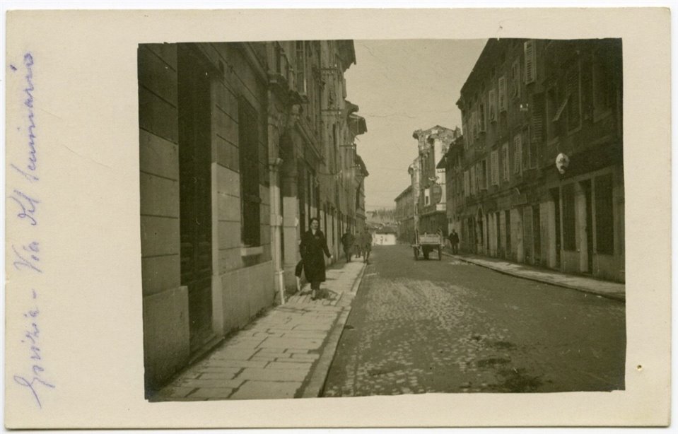 | NOTE | Sul recto: titolo manoscritto. Due soldati italiani percorrono via del Seminario; a destra gli edifici all'incrocio con via San Giovanni mostrano i danni provocati dalla guerra appena finita. |