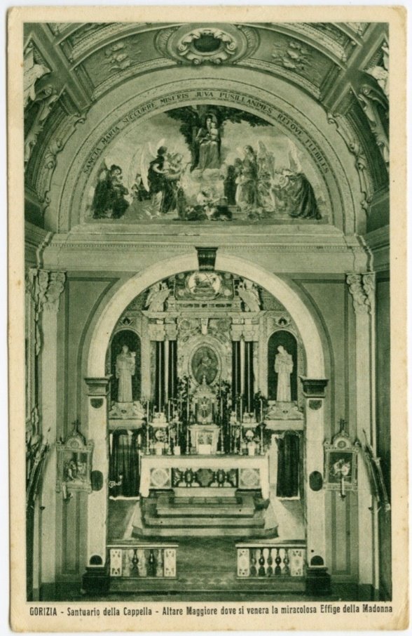 | NOTE | Sul recto didascalia: " Gorizia - Santuario della Cappella - Altare Maggiore dove si venera la miracolosa Effige della Madonna". Sul verso: "Stab. Pezzini - Milano (121)". Ripresa effetuata dopo i restauri iniziati nel 1924 e conclusi nel 1929 a seguito dei danni riportati durante il primo conflitto mondiale. |