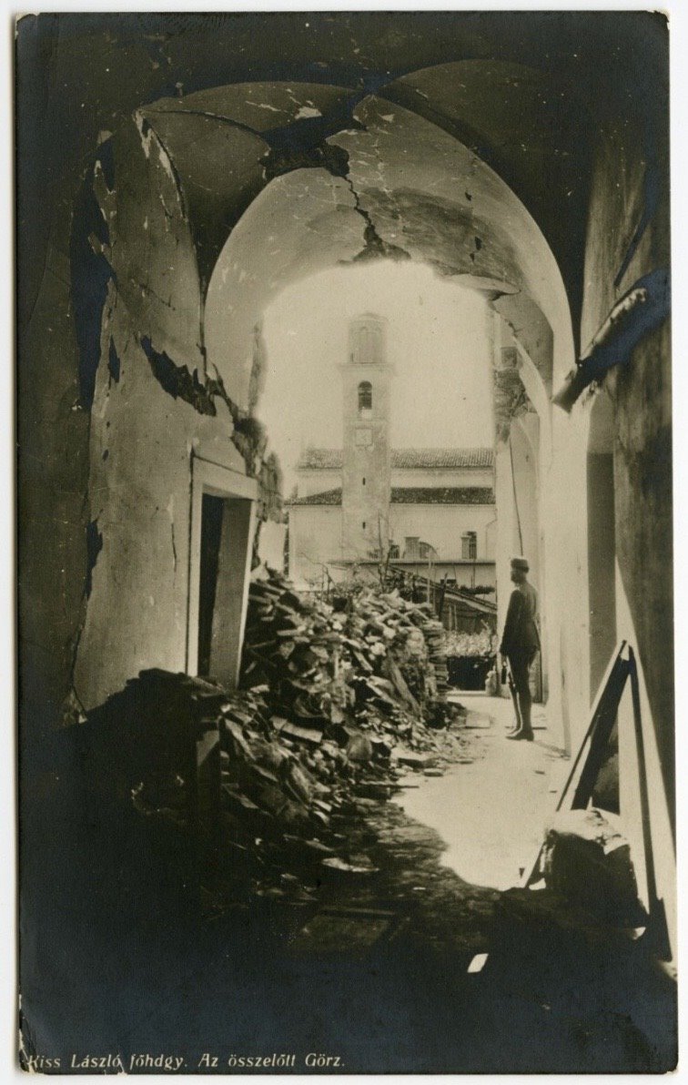 | NOTE | Sul recto: "Kiss László főhdgy. Az összelőtt Görz". Sul verso: "[logo] Hadifénykép kiállitás/ Az elesett hősök özvegyei és árvái javára (...)"; "Levelezö Lap A Hadsegélyezö Hivatal Kiadványa". Cartolina di una serie emessa in occasione di una mostra fotografica sulla guerra in corso per la raccolta di fondi a favore delle vedove e degli orfani di guerra (1916). |