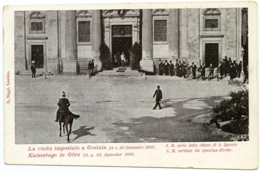 | NOTE | Sul recto: titolo; titolo in tedesco: "Kaisertage in Görz 29. u. 30. September 1900. S. M. verlässt die Ignatius-Kirke."; "E. Niggl, Gorizia"; nell'angolo in basso a destra dell'immagine, probabile marchio non identificato. Cartolina non viaggiata. Cartolina edita a ricordo della visita dell'imperatore Francesco Giuseppe a Gorizia il 29 e 30 settembre 1900, in occasione del quarto centenario dell'unione della Contea al casato degli Asburgo. Durante la mattina del primo giorno l'imperatore prese parte alla messa in suo onore in Sant'Ignazio. All'uscita passò in rassegna le truppe schierate in Piazza Grande. |