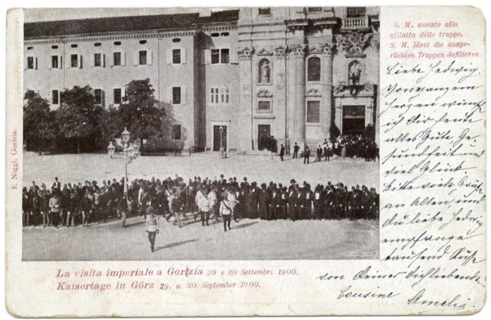 | NOTE | Sul recto: titolo; titolo parallelo "Kaisertage in Görz 29. u. 30. September 1900. S. M. lässt die ausgerückten Truppen defilieren."; "E. Niggl, Gorizia"; nell'angolo in basso a destra dell'immagine, probabile marchio non identificato. Cartolina viaggiata; data del timbro postale non leggibile. Cartolina edita a ricordo della visita dell'imperatore Francesco Giuseppe a Gorizia il 29 e 30 settembre 1900, in occasione del quarto centenario dell'unione della Contea al casato degli Asburgo. Durante la mattina del primo giorno, dopo la messa in Sant'Ignazio, l'imperatore passò in rassegna le truppe schierate in Piazza Grande. |