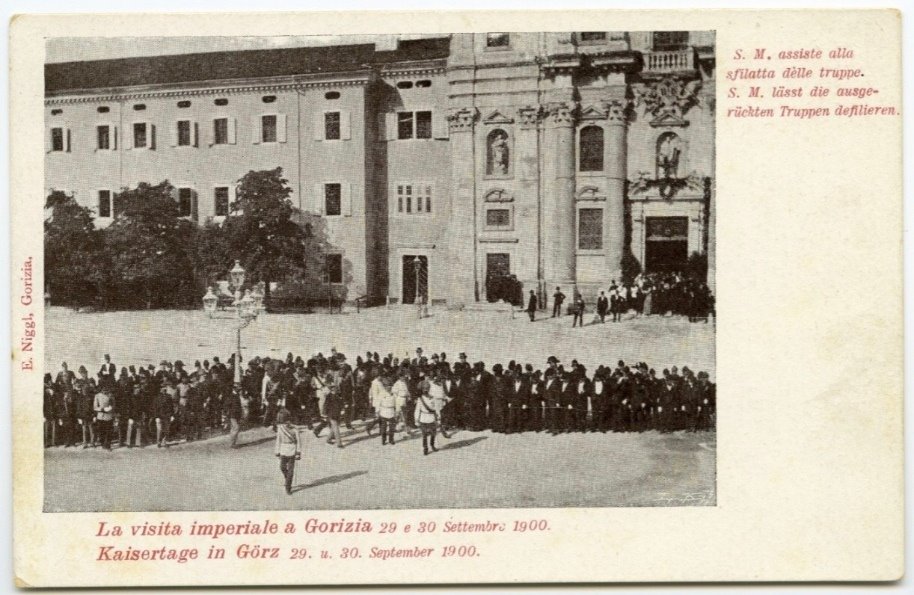 | NOTE | Sul recto: titolo; titolo parallelo "Kaisertage in Görz 29. u. 30. September 1900. S. M. lässt die ausgerückten Truppen defilieren."; "E. Niggl, Gorizia"; nell'angolo in basso a destra dell'immagine, probabile marchio non identificato. Cartolina non viaggiata. Cartolina edita a ricordo della visita dell'imperatore Francesco Giuseppe a Gorizia il 29 e 30 settembre 1900, in occasione del quarto centenario dell'unione della Contea al casato degli Asburgo. Durante la mattina del primo giorno, dopo la messa in Sant'Ignazio, l'imperatore passò in rassegna le truppe schierate in Piazza Grande. |