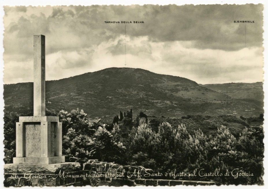 | NOTE | Sul recto, prima del titolo: "26". Sul verso: "Ediz. F. Brescia - Via Ghega, 8 - Tieste"; "Vera fotografia - Rip. Interdetta - 1955"; "[logo] Omniafoto". Bordi fustellati. Cartolina non viaggiata. La didascalia al centro indica erroneamente l'altopiano di Tarnova anziché il monte San Gabriele. Per il monumento cfr. Note inv. 02769. |