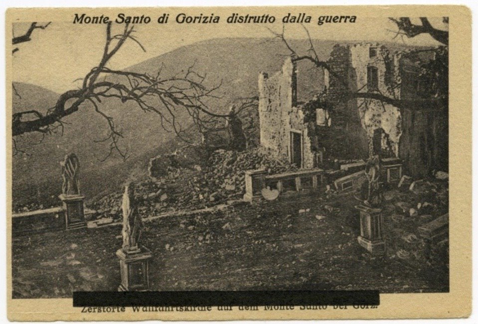 | NOTE | Sul verso: "Verlag Kartonagefabrik A. Pertot, Görz." Cartolina non viaggiata. Sul recto una pecetta copre parzialmente il titolo in tedesco. Cartolina probabilmente pubblicata tra l'agosto del 1916 e l'ottobre del 1917. Per la posizione ritenuta strategica chiesa e convento di Monte Santo furono colpiti dai bombardamenti dell'esercito italiano già nel giugno del 1915. |