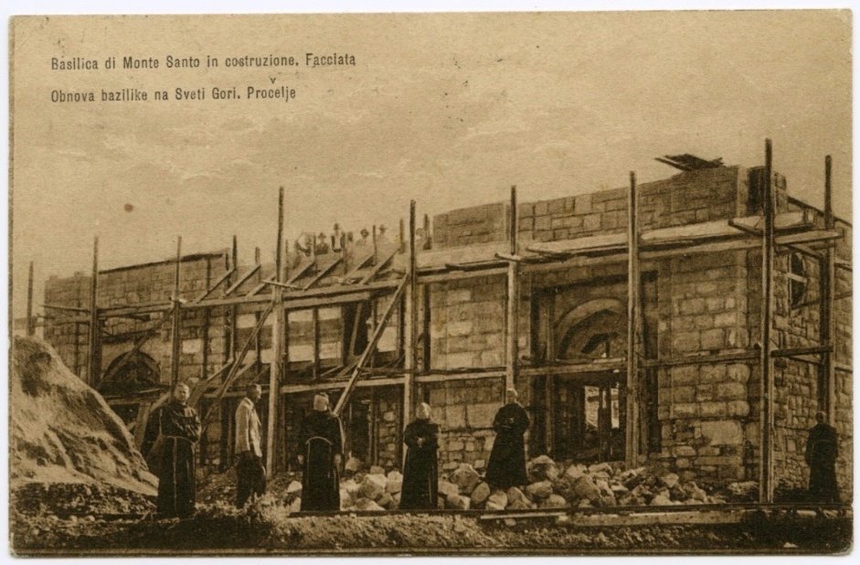 | NOTE | Sul recto: titolo; titolo paralelo "Obnova bazilike na Sveti Gori. Procelje". Sul verso: "10851 696 a S. Kleindienst. Fotograf, Solkan" Cartolina viaggiata il 05.11.1925. La chiesa di Monte Santo, distrutta nel corso della Prima guerra mondiale, fu ricostruita tra il 1924 e il 1928 su progetto dell'arch. Silvano Barich. |