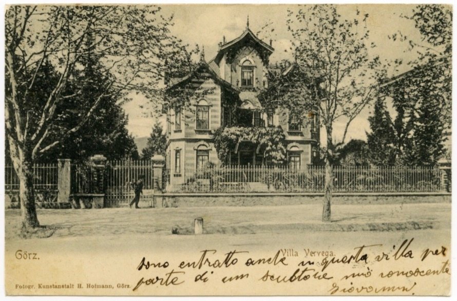 | NOTE | Sul recto: "Fotogr. Kunstanstalt H. Hofmann, Görz." Cartolina viaggiata nel 1903. Villa Vervega, progettata nel 1888, esempio di edificio in stile neogotico sull'allora corso Francesco Giuseppe. |