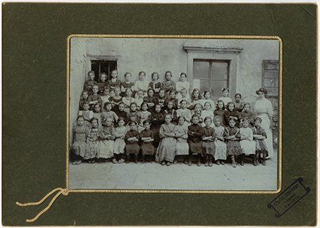 | Soggetto | Classe scolastica di bambine riprese nel cortile di un edificio. La giovane insegnante è ritratta in piedi accanto al gruppo |