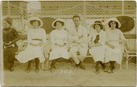 | Soggetto | Gruppo di donne con abbigliamento estivo sedute su panchine all'esterno di uno stabilimento balneare; sulla panchina al centro è seduto anche un uomo |