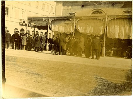 Uomini riuniti in capannelli e altri seduti ai tavolini, ripresi all'esterno del Caffè Teatro, lungo il corso Francesco Giuseppe (ora corso Italia) a Gorizia |