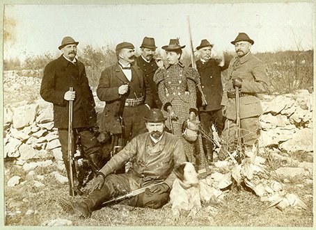 Gruppo di cacciatori in posa con un cane, all'aperto |