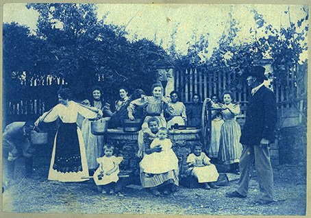 Giovani donne e una portatrice d'acqua con arconcello e secchi, ritratte con dei bambini intorno a un pozzo |